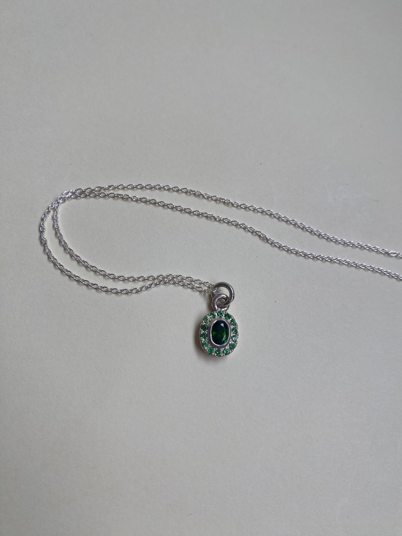 Sterling silver necklace with an oval Chrome Diopside surrounded by green tsavorite garnets